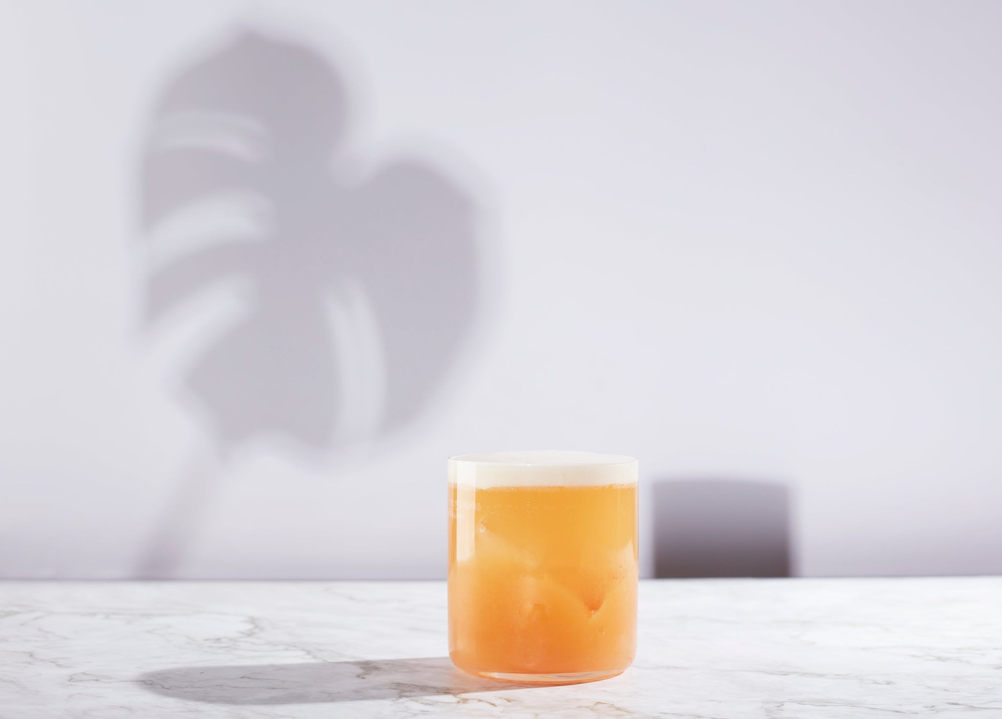 DOUBLE SHAKE... Add all ingredients to a shaker with NO ICE and shake. Fill shaker with Ice. Shake again and strain into a rocks glass.