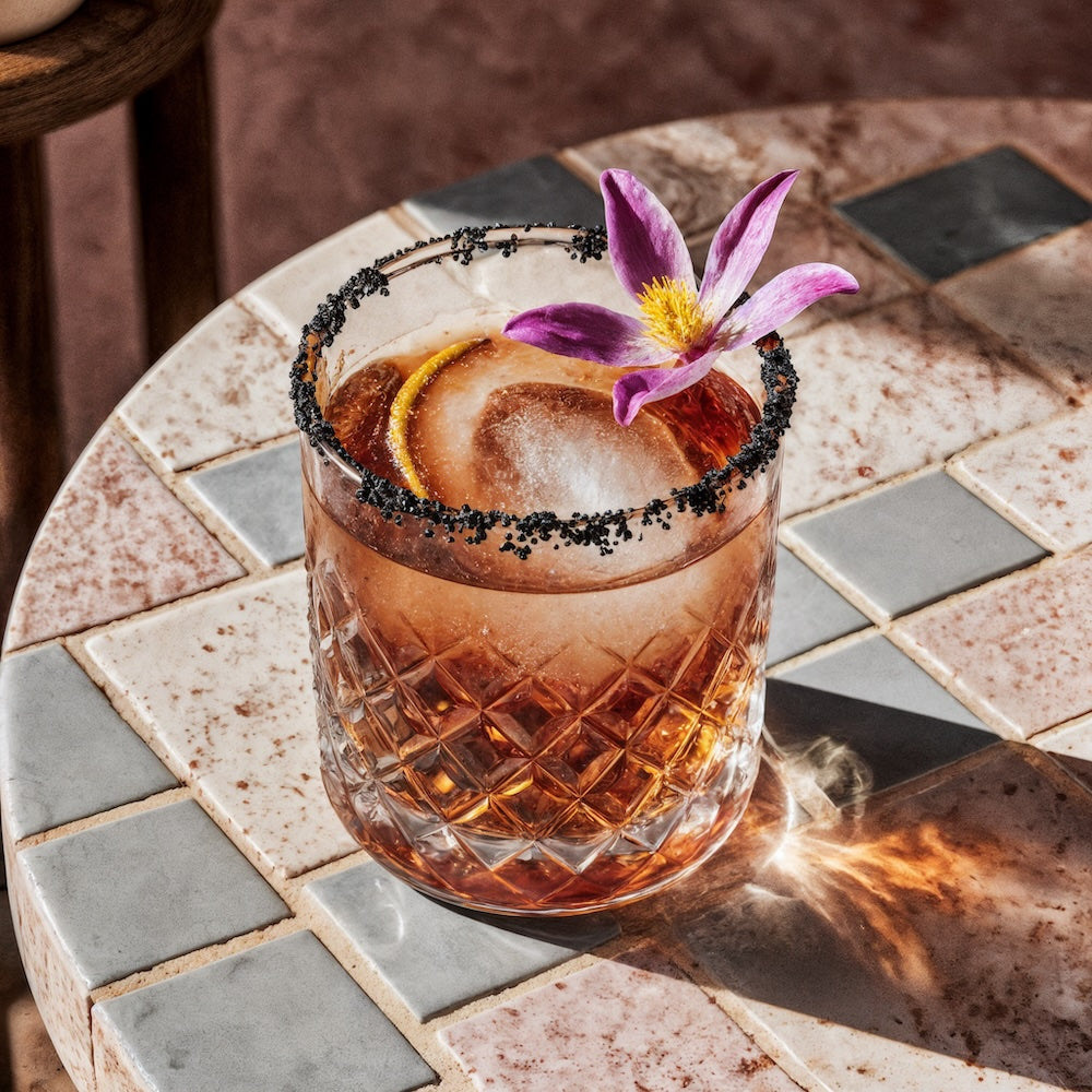 Shake all ingredients hard with ice, double strain into a rocks glass over a large clear ice cube with a fine black salt rim. Garnish with edible flowers.