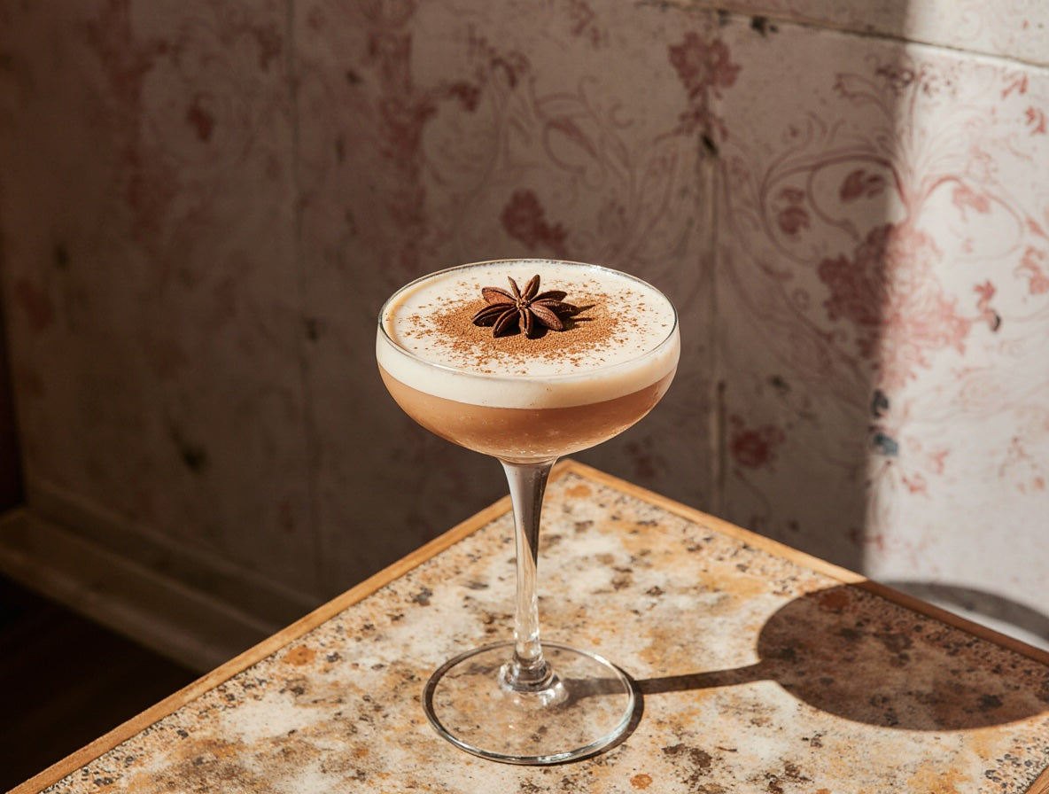 Dry shake all ingredients, then shake again with ice. Double strain into chilled coupe. Garnish with dusting of cinnamon and nutmeg, single star anise on foam