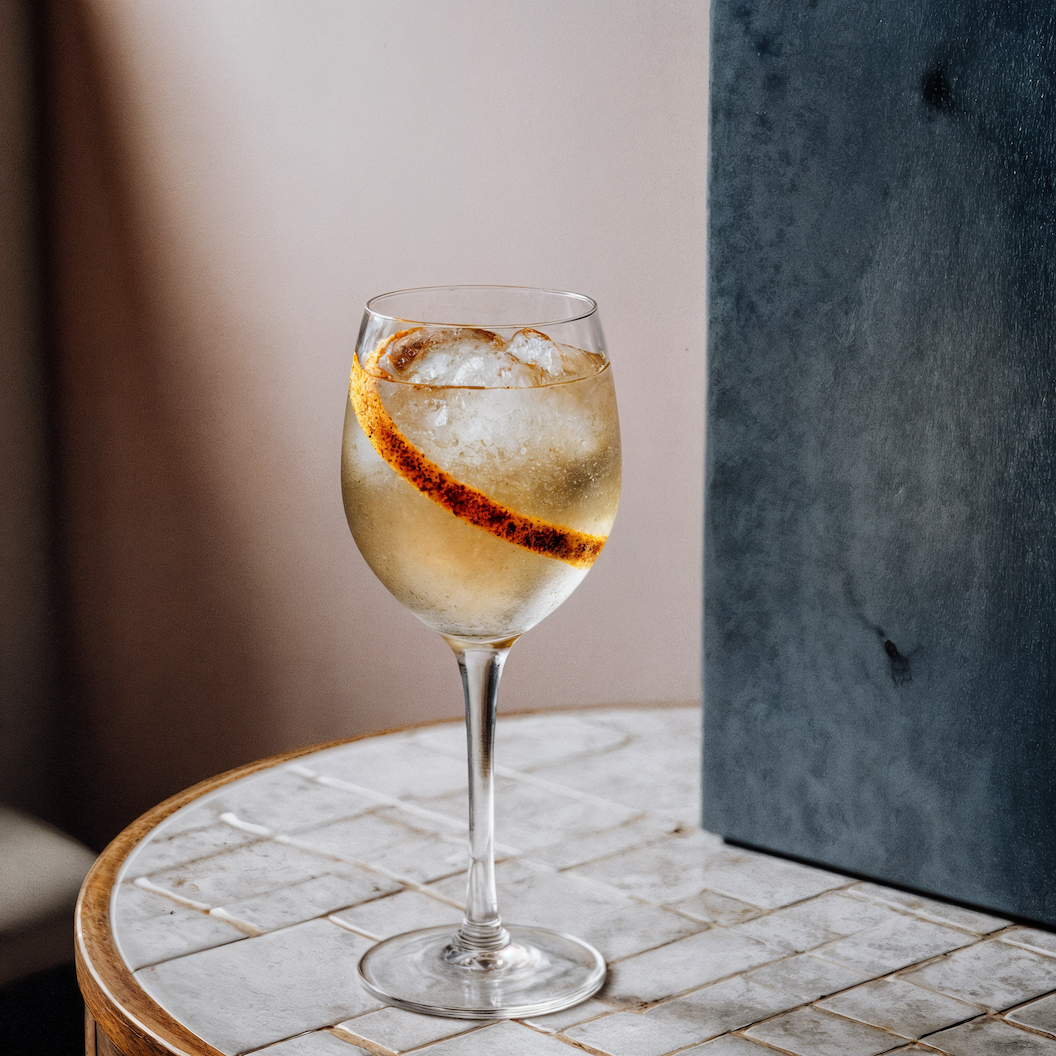 Add CROSSIP, saffron strands, and lemon juice directly to a stemmed wine glass over cubed ice. Top with blood orange soda and stir gently — the saffron will naturally infuse into the drink as it builds. Garnish with orange twist and saffron strands