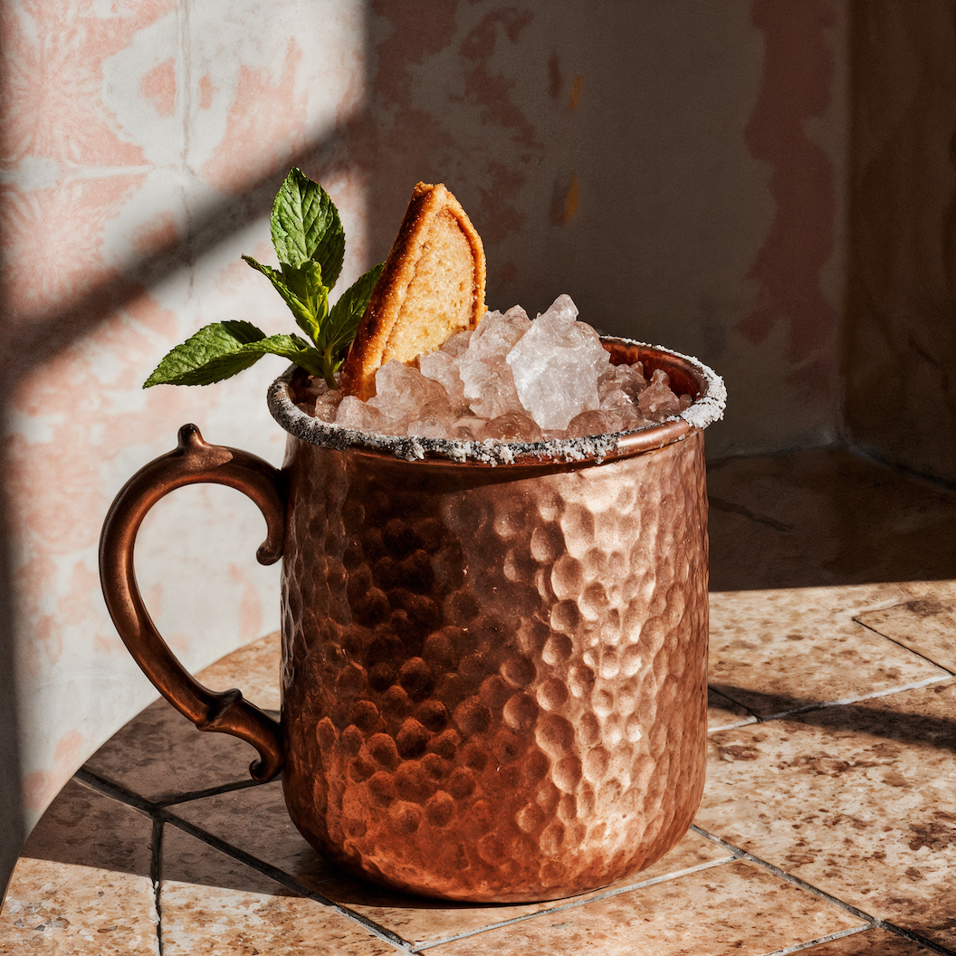 Shake CROSSIP, tamarind, and lime with ice, strain into mule mug over crushed ice, top with ginger beer, stir gently. Garnish with candied ginger slice and a small mint sprig